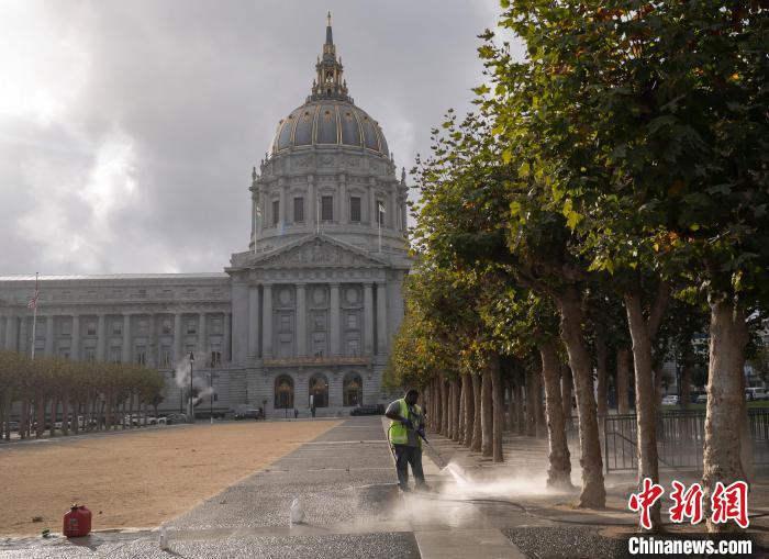 當(dāng)?shù)貢r間11月6日,工作人員在舊金山市政廳前的市政中心廣場清潔地面。 中新社記者 劉關(guān)關(guān) 攝