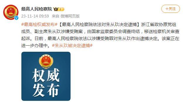 中新網(wǎng)11月14日電 據(jù)最高人民檢察院官方微博消息,浙江省政協(xié)原黨組成員、副主席朱從玖涉嫌受賄案,由國(guó)家監(jiān)察委員會(huì)調(diào)查終結(jié),移送檢察機(jī)關(guān)審查起訴。日前,最高人民檢察院依法以涉嫌受賄罪對(duì)朱從玖作出逮捕決定。該案正在進(jìn)一步辦理中。