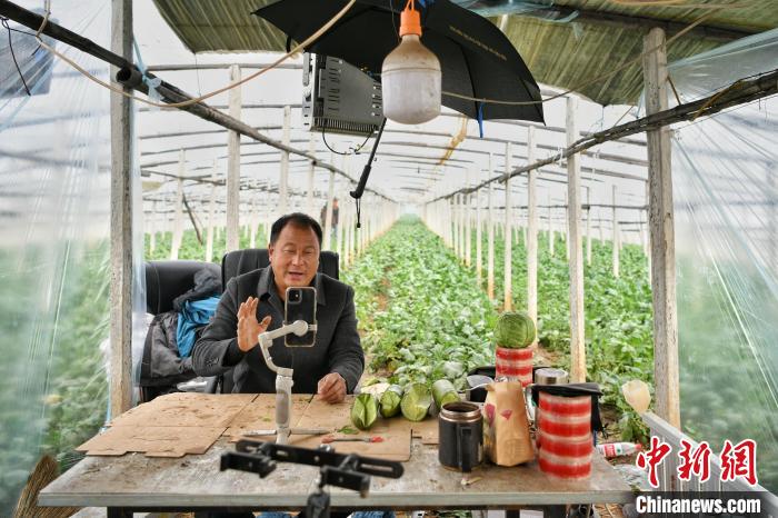 11月18日,在天津市西青區(qū)辛口鎮(zhèn)種植沙窩蘿卜的大棚內,農民郭芝振通過手機直播推介沙窩蘿卜?!≈行律缬浾?佟郁 攝