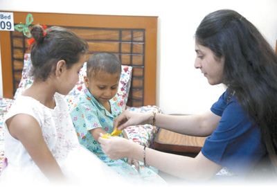 考慮到兒童病患的特殊性,“小家”一直將孩子們的心理疏導(dǎo)作為志愿工作的重點(diǎn)。“孩子們的心理狀態(tài)很重要。”“小家”巴方負(fù)責(zé)人蘇比婭·阿德南說。阿德南有30多年的兒童公益服務(wù)經(jīng)歷,在她和巴中兩國同事的引導(dǎo)下,孩子們相互鼓勵(lì)支持,在閑暇時(shí)制作各種手工藝品布置“小家”。
