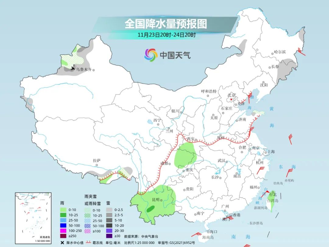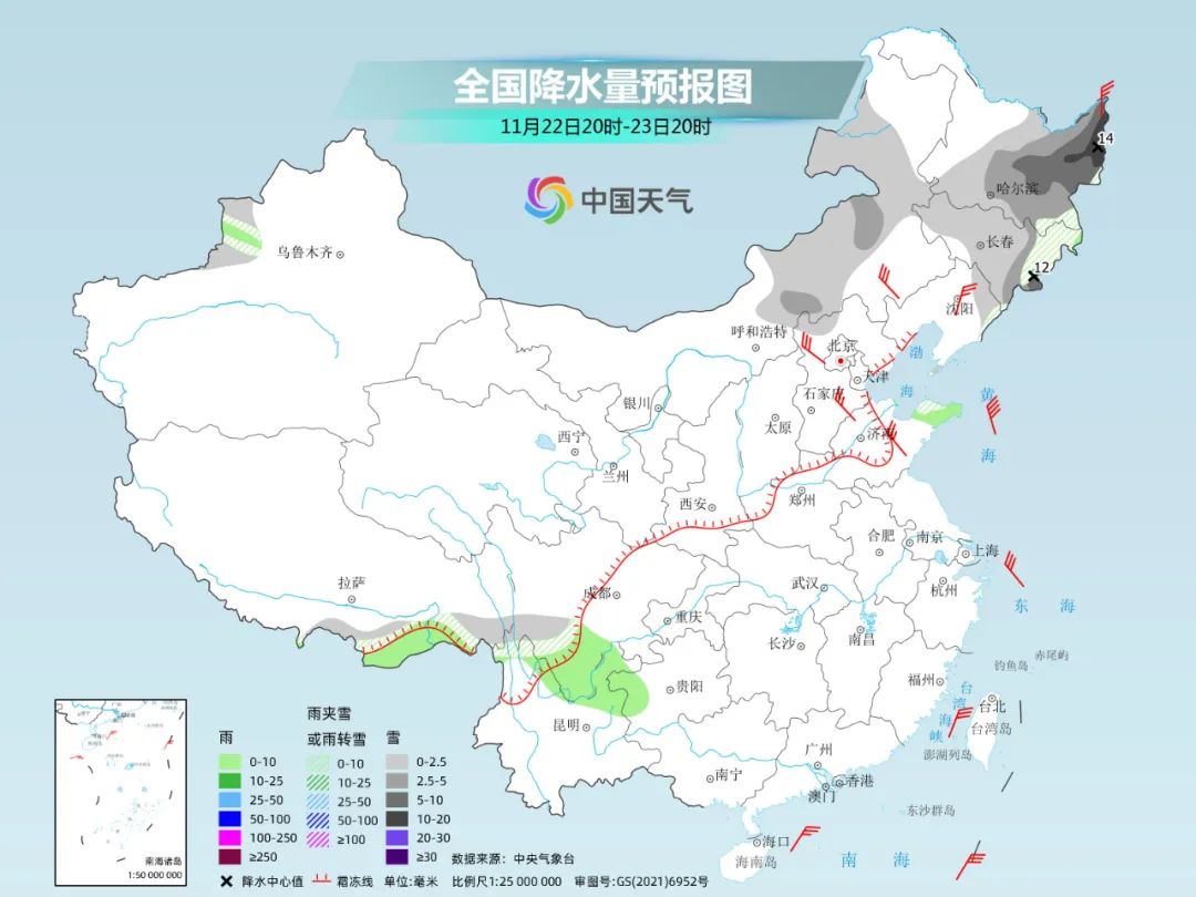 后天,我國大部又將回到降水稀少的狀態(tài),其中,內(nèi)蒙古東北部、黑龍江東部、吉林東部、新疆沿天山地區(qū)和伊犁河谷、西藏南部、山東半島北部等地部分地區(qū)有小雪或雨夾雪;新疆伊犁河谷等地部分地區(qū)有中到大雪。