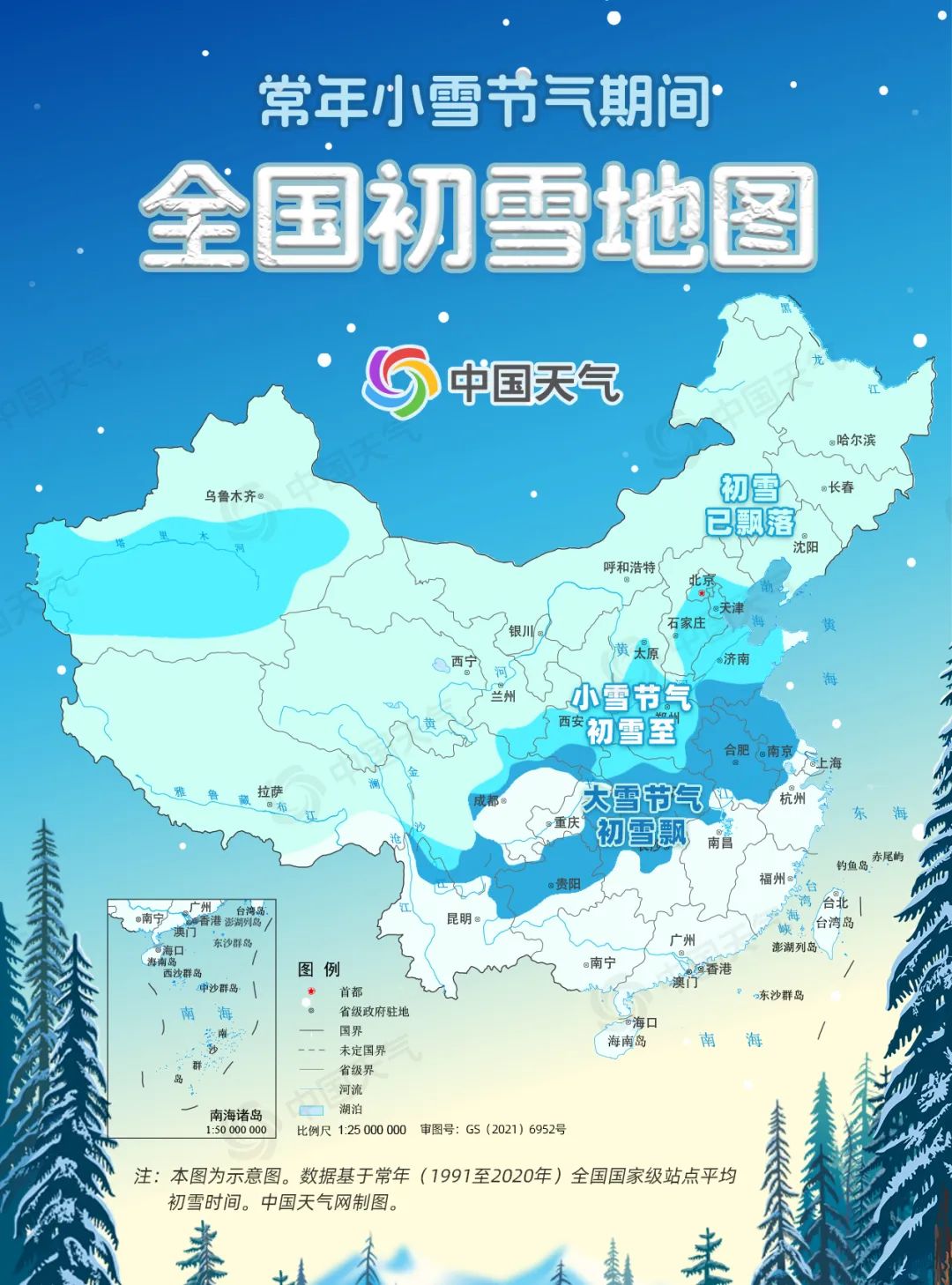 而從常年小雪節(jié)氣期間全國初雪地圖可以看出,除了華北、黃淮一帶會在小雪節(jié)氣期間迎來初雪以外,長江中下游地區(qū)一般要到大雪節(jié)氣才會見到雪花;至于再往南的華南地區(qū),一年中能不能見到雪確實就要看運氣了。
