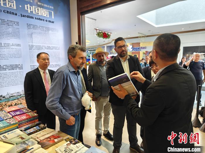 廈門外圖集團有限公司工作人員向巴西伊瓜蘇議長莫拉雷斯(右二)介紹中文書籍。廈門市宣傳部供圖