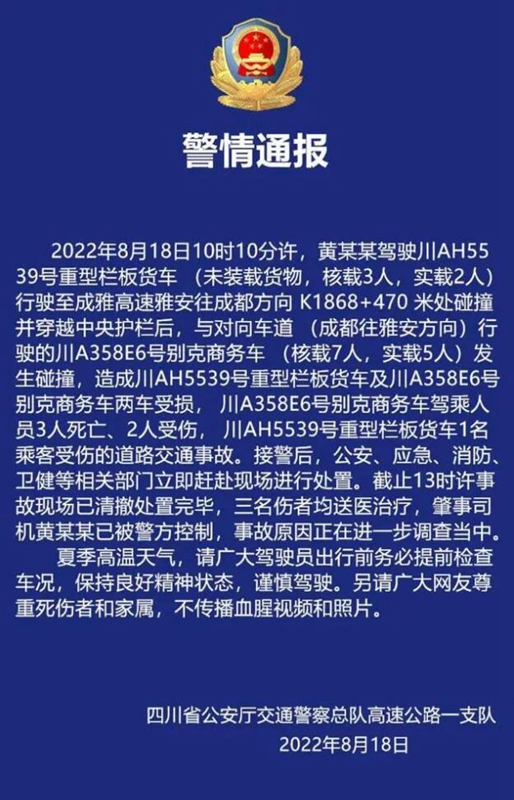 2022年8月18日10時10分許,G5京昆高速公路成雅段K1868公里+150米路段(成都市蒲江縣境內(nèi))發(fā)生川 AH55**貨車沖斷中央護(hù)欄與對向正常行駛的川A35***小客車發(fā)生碰撞,造成小客車內(nèi)3人當(dāng)場死亡,小客車內(nèi)2人和大貨車內(nèi)1人受傷、2車及高速公路路產(chǎn)受損的道路交通事故,直接經(jīng)濟(jì)損失約350萬元。