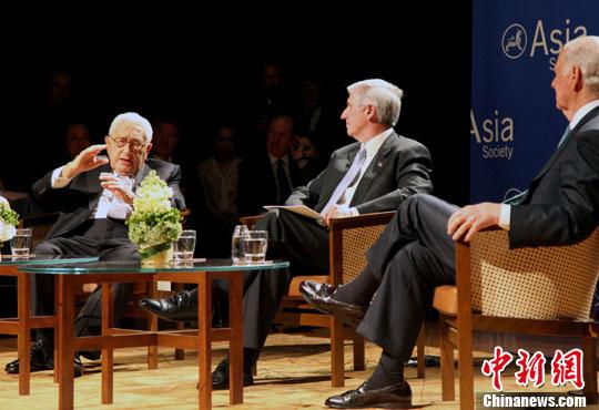 資料圖:美國前國務卿亨利·基辛格(左)與前國務卿詹姆斯·貝克等人進行有關美中關系的對話。中新社發(fā) 王歡 攝