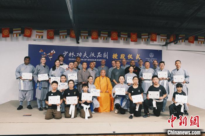當(dāng)?shù)貢r(shí)間12月1日,澳大利亞少林寺禪武堂于1日在悉尼隆重舉行大洋洲少林功夫段品制授段儀式,少林寺方丈釋永信親臨現(xiàn)場(chǎng),為當(dāng)?shù)厣倭止Ψ驉?ài)好者授予段位。(張浩鑫 攝)