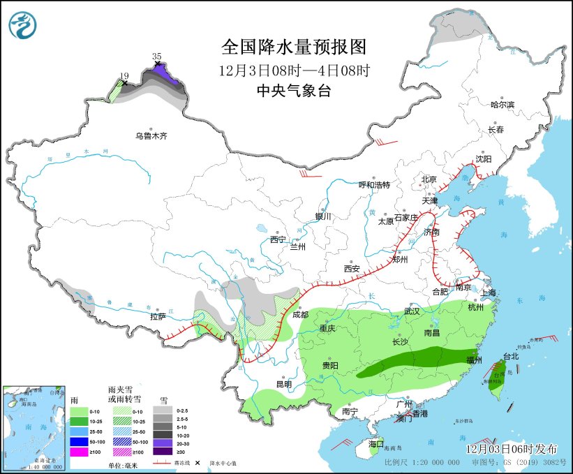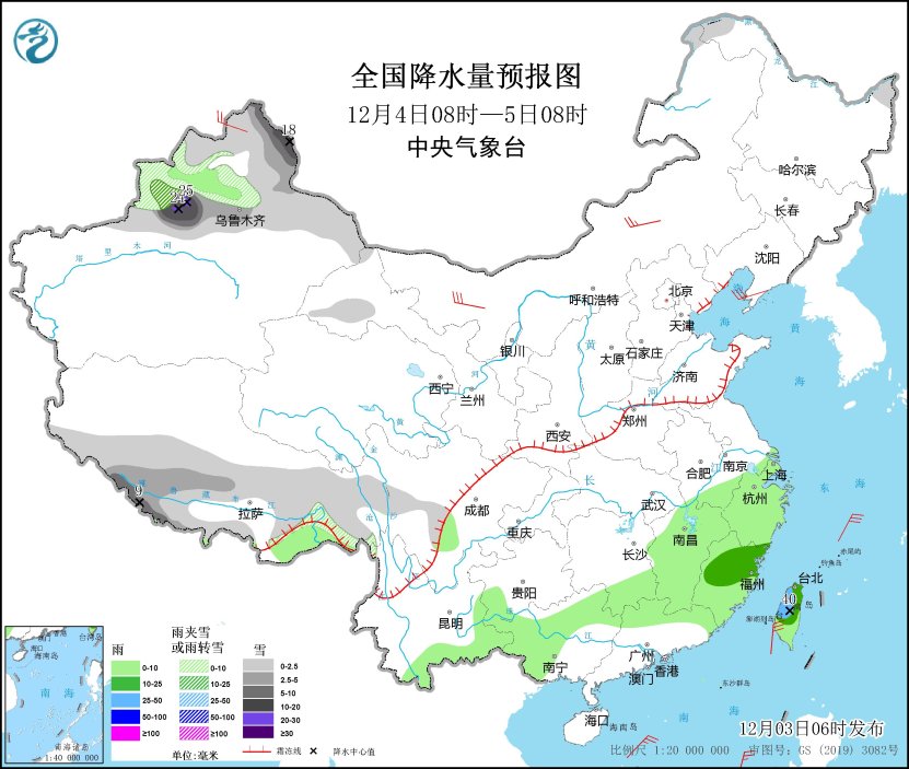 12月3日08時至4日08時,新疆北部、內蒙古東北部、黑龍江西北部、西藏西南部和東部、川西高原等地部分地區(qū)有小到中雪或雨夾雪,其中,新疆北疆北部等地部分地區(qū)有大到暴雪,局地大暴雪或特大暴雪(30~35毫米)。江南、西南地區(qū)東部和南部、華南北部和西部、臺灣島等地部分地區(qū)有小雨,其中,湖南南部、江西中南部、福建中部、廣西東北部、臺灣島中北部等地部分地區(qū)有中雨。內蒙古中西部等地部分地區(qū)有4~6級風。
