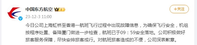 中新網(wǎng)12月3日電 據(jù)中國東方航空官方微博消息,3日該司上海虹橋至香港一航班飛行過程中出現(xiàn)故障信息,為確保飛行安全,機(jī)組按程序處置、備降廈門做進(jìn)一步檢查,航班已于09:59安全落地。