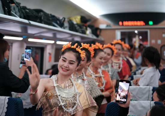 4月13日,老撾工作人員在中老鐵路上開行的D887次國(guó)際旅客列車上表演。(新華社記者邢廣利攝)