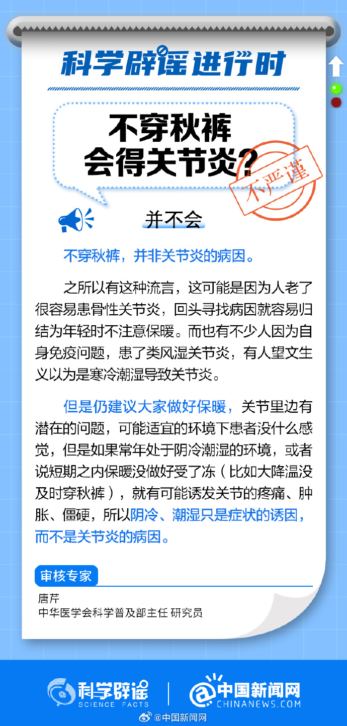 中新網(wǎng)12月11日電 不穿秋褲,并非關(guān)節(jié)炎的病因。之所以有這種流言,這可能是因?yàn)槿死狭撕苋菀谆脊切躁P(guān)節(jié)炎,回頭尋找病因就容易歸結(jié)為年輕時(shí)不注意保暖。而也有不少人因?yàn)樽陨砻庖邌栴},患了類風(fēng)濕關(guān)節(jié)炎,有人望文生義以為是寒冷潮濕導(dǎo)致關(guān)節(jié)炎。但陰冷、潮濕是疼痛、僵硬等關(guān)節(jié)炎癥狀的誘因(而不是病因),仍建議大家做好保暖。(來源:@科學(xué)辟謠 @中國新聞網(wǎng))