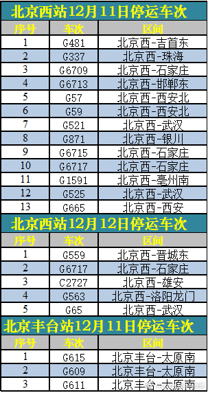 中新網(wǎng)12月11日電 據(jù)北京西站官方微博消息,受降雪影響,12月11日、12月12日北京西站、北京豐臺站部分列車停運,已購買停運列車車票的旅客,可于30日內(nèi)辦理全額退票手續(xù)。請廣大旅客合理安排出行,關注鐵路部門公告。