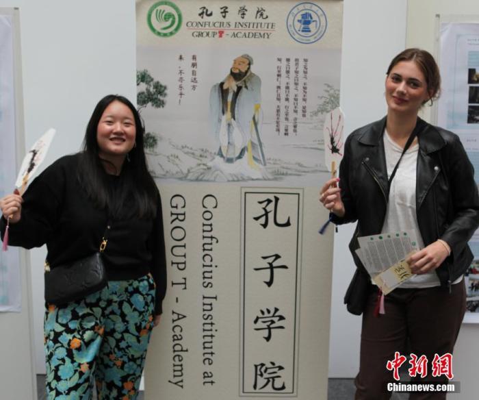當(dāng)?shù)貢r間2023年10月19日,比利時魯汶孔子學(xué)院舉辦“孔子學(xué)院日”活動,魯汶大學(xué)學(xué)子參與活動,體驗中華文化。圖為兩名青年體驗中國吹墨畫后,揮舞“作品”合影留念。