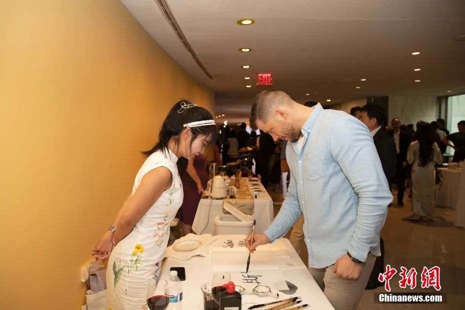 資料圖:當(dāng)?shù)貢r(shí)間6月29日晚,“何以文明”特展發(fā)布儀式在紐約聯(lián)合國(guó)總部舉行,與會(huì)嘉賓體驗(yàn)中國(guó)書(shū)法。中新社記者 廖攀 攝