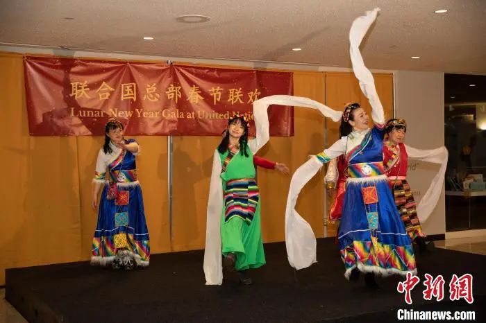 資料圖:當(dāng)?shù)貢r(shí)間1月20日,聯(lián)合國(guó)中國(guó)書(shū)會(huì)舞蹈團(tuán)在紐約聯(lián)合國(guó)總部舉辦的春節(jié)聯(lián)歡晚會(huì)上表演《格桑拉》。中新社記者 廖攀 攝