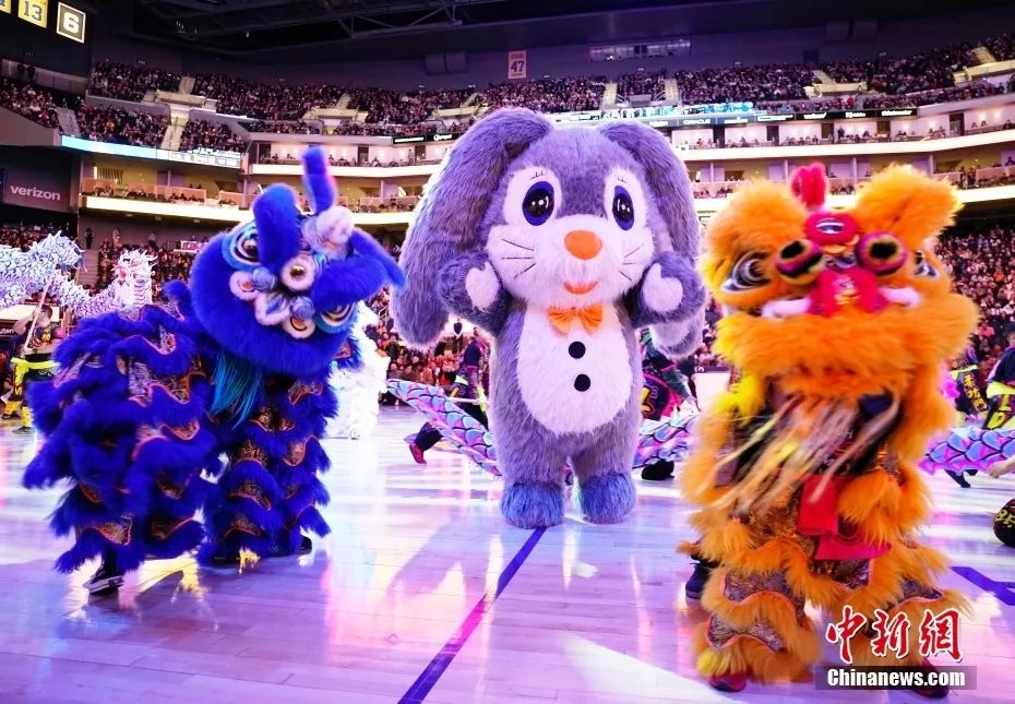 資料圖:當(dāng)?shù)貢r(shí)間1月22日,中國(guó)農(nóng)歷新年正月初一晚,美職籃(NBA)金州勇士隊(duì)在主場(chǎng)迎戰(zhàn)布魯克林籃網(wǎng)隊(duì)的比賽中,按照多年的傳統(tǒng)慶祝中國(guó)農(nóng)歷新年的到來(lái)。圖為兔子人偶出現(xiàn)在舞龍舞獅表演中。中新社記者 劉關(guān)關(guān) 攝