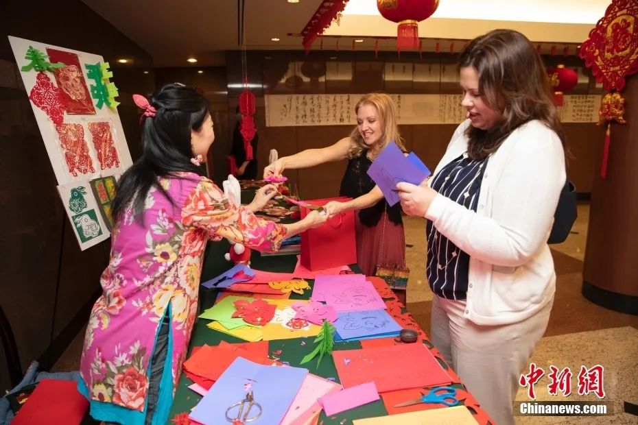 資料圖:來(lái)賓在招待會(huì)現(xiàn)場(chǎng)體驗(yàn)中國(guó)傳統(tǒng)年俗文化剪紙。中新社記者 廖攀 攝