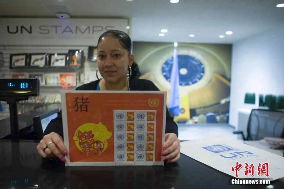 資料圖:2019年1月11日,為慶祝即將到來(lái)的中國(guó)農(nóng)歷己亥豬年,聯(lián)合國(guó)郵政管理處正式發(fā)行“中國(guó)農(nóng)歷生肖”系列己亥豬年特別版郵票。圖為紐約聯(lián)合國(guó)總部郵管處銷(xiāo)售點(diǎn)的工作人員展示己亥豬年特別版郵票。中新社記者 馬德林 攝