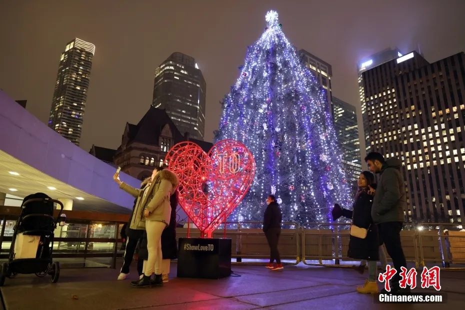 資料圖:當(dāng)?shù)貢r(shí)間2021年12月24日,圣誕平安夜,加拿大多倫多市政廳廣場(chǎng)的圣誕樹(shù)與愛(ài)心造型的彩燈吸引民眾駐足留影。中新社記者 余瑞冬 攝