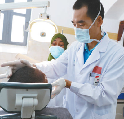 在納茲莫加醫(yī)院,口腔科醫(yī)生盛磊給患者看病。