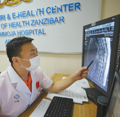 從第一臺X光機、CT設(shè)備,再到目前整個桑給巴爾地區(qū)唯一一臺核磁共振機,納茲莫加醫(yī)院影像科的設(shè)備物資都來自中國捐贈。不久前,影像科還增添了遠程視頻設(shè)備。通過遠程技術(shù),中國醫(yī)療隊可以對接中國國內(nèi)優(yōu)質(zhì)醫(yī)療資源,對當?shù)貜碗s病例進行在線會診。桑給巴爾地區(qū)現(xiàn)有的5名影像科醫(yī)生,就是在一批批中國醫(yī)療隊隊員的帶教下成長起來的。