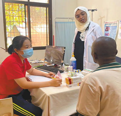 醫(yī)療隊在桑給巴爾島開展義診,圖為內(nèi)科醫(yī)生劉翠霞(左一)接診患者。