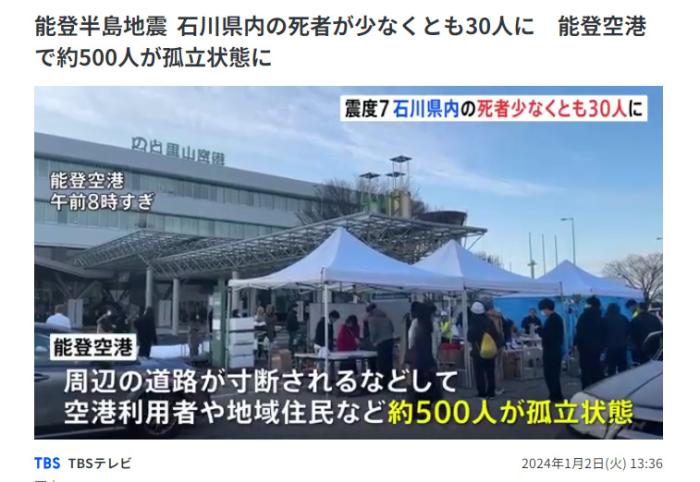 中新網(wǎng)1月2日電 據(jù)日本東京廣播公司(TBS)報道,截至目前,日本地震已造成石川縣至少30人死亡,當(dāng)局已確認(rèn)輪島市發(fā)生14起被困事件。