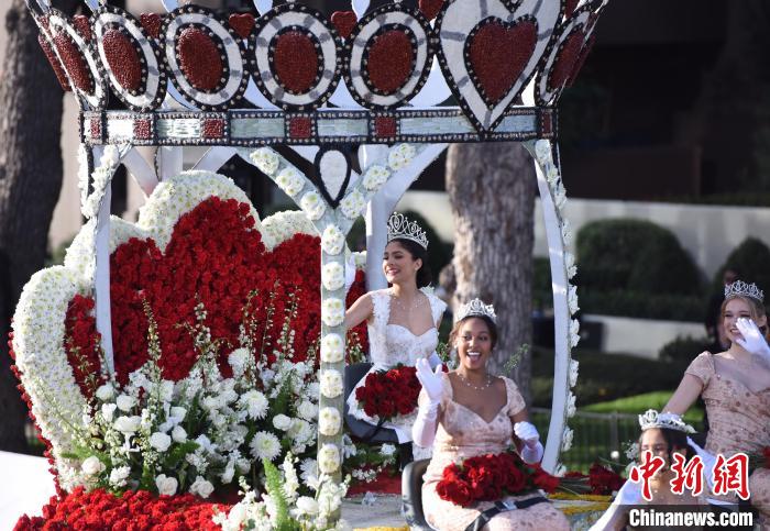 當(dāng)?shù)貢r間1月1日上午,第135屆美國玫瑰花車游行在加利福尼亞州歷史文化名城帕薩迪納市舉行。圖為2024年度“玫瑰皇后和玫瑰公主”花車。 中新社記者 張朔 攝