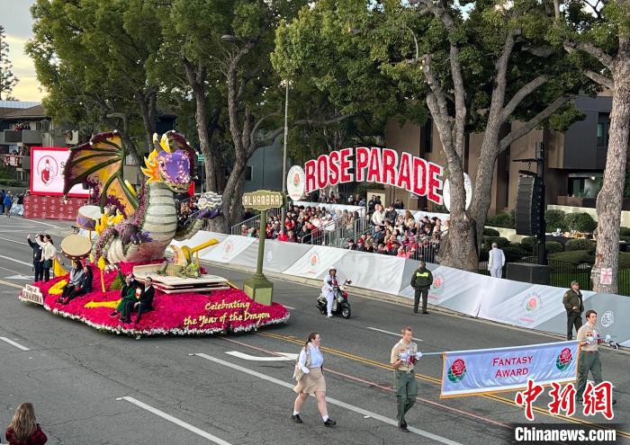 當(dāng)?shù)貢r間1月1日上午,第135屆美國玫瑰花車游行在加利福尼亞州歷史文化名城帕薩迪納市舉行。圖為南加州阿罕布拉市帶來的“慶祝龍年”主題花車。 中新社記者 張朔 攝