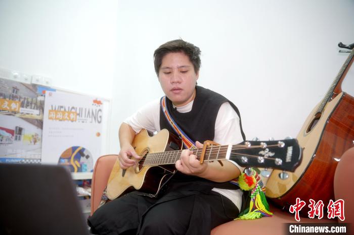 圖為賴淑珍邊彈吉他邊哼唱著歌曲《青青之約》。 中新社記者 李思源 攝