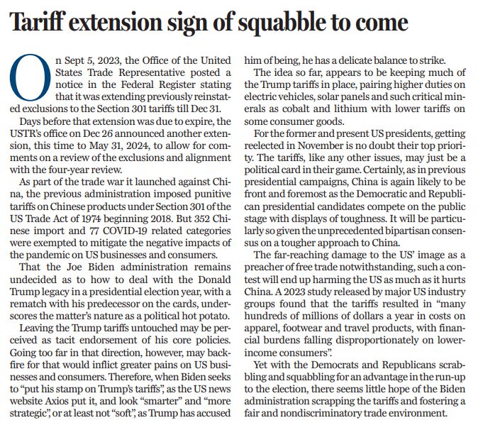 美國貿(mào)易代表辦公室近期宣布,進(jìn)一步延長對352項(xiàng)已恢復(fù)豁免的中國進(jìn)口商品和77種與新冠防疫相關(guān)的中國商品的301條款關(guān)稅豁免期,期限由2023年12月31日延至2024年5月31日。