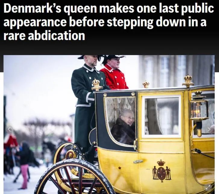 當(dāng)?shù)貢r(shí)間1月4日,是丹麥女王瑪格麗特二世最后一次以君主身份公開露面?,F(xiàn)年83歲的女王乘坐“金馬車”穿過丹麥?zhǔn)锥?,不少民眾冒著?yán)寒、強(qiáng)風(fēng)和雨雪,在沿途為她揮舞旗幟并歡呼。
