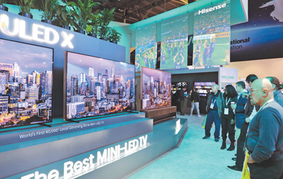 海信攜全球首款8K屏幕發(fā)聲激光電視、全球首款40000+分區(qū)Mini LED電視——110UX電視等全場(chǎng)景顯示技術(shù)解決方案亮相展會(huì)(見上圖,本報(bào)記者李志偉攝)。在110UX電視展品前,很多人駐足觀看,高清畫質(zhì)不時(shí)獲得稱贊。獲得“2024 CES創(chuàng)新獎(jiǎng)”的海信車用激光顯示技術(shù),展示了激光顯示在車載領(lǐng)域的潛力。海信國(guó)際營(yíng)銷公司副總裁戴維·戈?duì)柕聦?duì)記者表示,海信致力于將顯示技術(shù)融入生活,為消費(fèi)者提供超越屏幕的體驗(yàn),讓其成為生活的一部分。