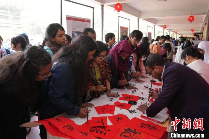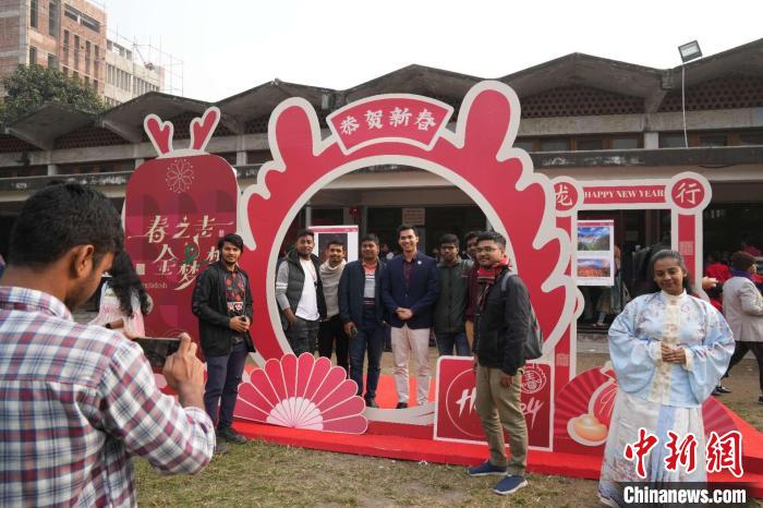 此次活動(dòng),受到達(dá)卡大學(xué)師生及當(dāng)?shù)孛癖姷臍g迎。數(shù)百份“?!弊帧⒋郝?lián)、年畫(huà)、中國(guó)結(jié)、燈籠,營(yíng)造濃濃的節(jié)日氛圍;近3000人次學(xué)生體驗(yàn)寫(xiě)福字、穿漢服等傳統(tǒng)文化;精彩的舞獅表演贏得陣陣喝彩;“恭賀新春”打卡區(qū)更是排起長(zhǎng)龍……