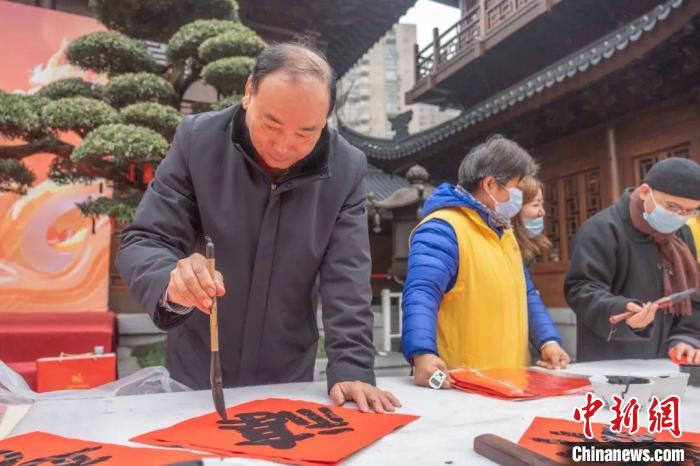 中新網(wǎng)上海1月21日電(記者 范宇斌)21日,“龍興歲時(shí)旺 送福百萬家”——2024年玉佛禪寺新春送?;顒?dòng)在上海玉佛禪寺啟動(dòng)。上海覺群書畫院理事長、玉佛禪寺方丈覺醒法師表示,迎新貼“?!弊质莻鹘y(tǒng)的年俗文化,也是中華兒女對于美好生活、光明未來的共同期待。