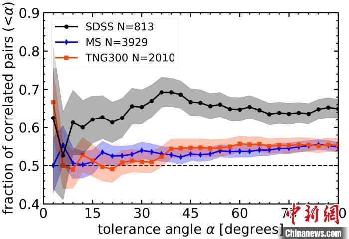 同向運動衛(wèi)星星系對占比隨張角的變化:黑色帶圓點的實線為觀測結(jié)果,藍線和紅線為理論模擬預測結(jié)果,黑色虛線為隨機分布,陰影區(qū)為自舉標準誤差范圍。中國科學院國家天文臺/供圖