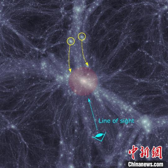 往大質(zhì)量星系群中掉落的星系(圖片來源:廖世鴻),紅色區(qū)域為一個大質(zhì)量星系群,黃色圓圈里的為正沿著大尺度纖維狀結(jié)構(gòu)掉落的星系,它們相對于中央星系沿相同方向運動。中國科學院國家天文臺/供圖