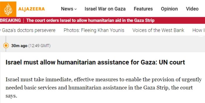 卡塔爾半島電視臺稱,國際法院責成以色列采取更多措施保護巴勒斯坦人,但沒有命令其結(jié)束在加沙地帶的軍事行動。此外,國際法院要求以色列在一個月內(nèi)就其已采取的行動向國際法院提交報告。