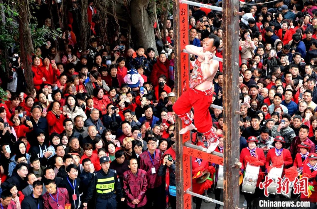 “僮身”表演者在莆禧古城“上刀梯”祈福。中新社記者 王東明 攝