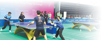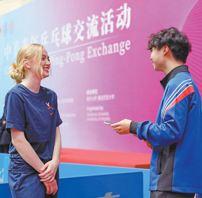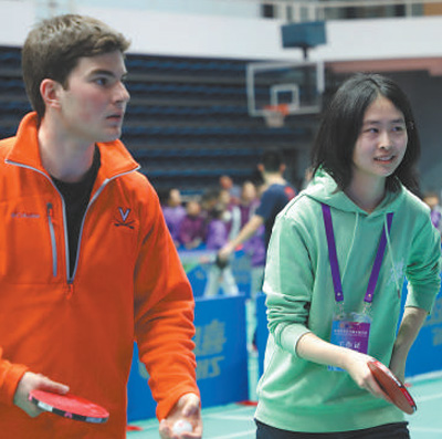 弗吉尼亞大學學生米莎與清華大學學生曾加寶組成搭檔。在練習環(huán)節(jié)中,對手朝著米莎的方向打來一記高難度弧圈球,米莎一時間有些不知所措,只聽曾加寶喊了一句“我來”,便眼疾手快地沖了過去,擋在米莎前面,接住了這個球。這有趣又溫馨的一幕,引來了現(xiàn)場觀眾的掌聲,也瞬間拉近了兩個年輕人的距離?!拔业拇顧n一直鼓勵我,耐心地指導我握拍、擊球。我們一起討論乒乓球和學業(yè),現(xiàn)在已經(jīng)成了朋友?!泵咨f。