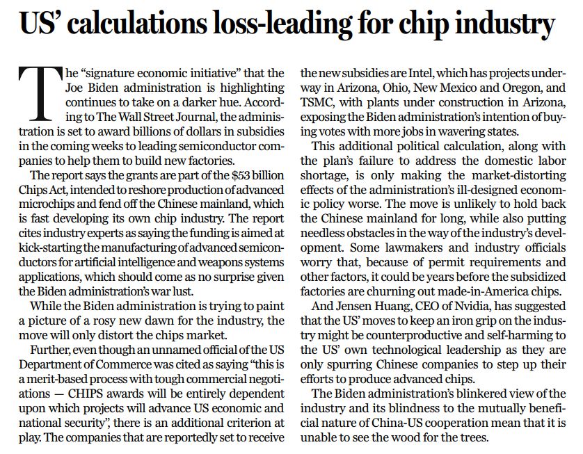 美國(guó)失策的經(jīng)濟(jì)政策本已造成市場(chǎng)扭曲,疊加出于政治意圖的算計(jì),以及補(bǔ)貼也無(wú)法解決的勞動(dòng)力短缺問(wèn)題,這一切只會(huì)讓扭曲態(tài)勢(shì)進(jìn)一步惡化。此舉不太可能長(zhǎng)期遏制中國(guó)大陸,但卻給行業(yè)發(fā)展帶來(lái)種種不必要的障礙。美國(guó)部分國(guó)會(huì)議員及企業(yè)高管擔(dān)心,受到許可要求及其他因素影響,享受補(bǔ)貼的企業(yè)可能要花費(fèi)很多年才能生產(chǎn)出美國(guó)制造的芯片。