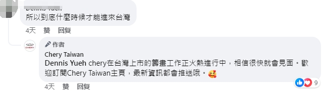 早前,奇瑞官方在臉書創(chuàng)立“Chery Taiwan”,并從去年開始更新專業(yè)內容,針對一款中型運動型多用途汽車已多次發(fā)布宣傳影片。有不少臺灣網友在該賬號咨詢該款汽車何時會在臺灣上市,該賬號回復,目前在臺灣上市的籌劃工作正火熱進行中,相信很快就會見面。
