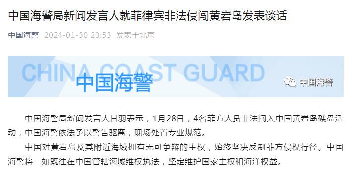 中新網1月31日電 據(jù)中國海警微信公眾號30日消息,中國海警局新聞發(fā)言人甘羽表示,1月28日,4名菲方人員非法闖入中國黃巖島礁盤活動,中國海警依法予以警告驅離,現(xiàn)場處置專業(yè)規(guī)范。