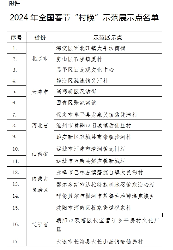 中新網(wǎng)2月1日電 據(jù)文化和旅游部網(wǎng)站消息,文化和旅游部辦公廳近日發(fā)布《關(guān)于公布2024年春節(jié)“村晚”示范展示點名單的通知》,根據(jù)文化和旅游部春節(jié)活動有關(guān)部署,在各省級文化和旅游行政部門申報推薦的基礎上,文化和旅游部研究確定了2024年春節(jié)“村晚”示范展示點名單。