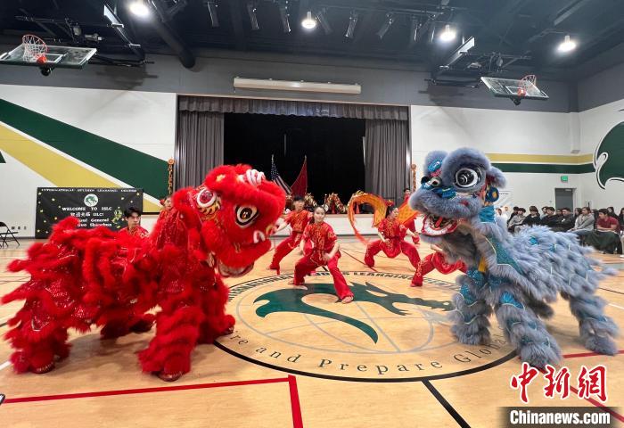 當(dāng)?shù)貢r(shí)間2月5日下午,中國人民大學(xué)附屬中學(xué)藝術(shù)團(tuán)在美國洛杉磯國際研究學(xué)習(xí)中心進(jìn)行交流演出。圖為武術(shù)《龍騰虎躍》?!≈行律缬浾?張朔 攝