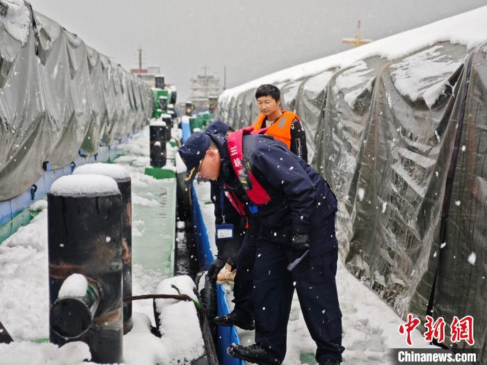 長(zhǎng)江航運(yùn)工作人員風(fēng)雪中保障渡運(yùn)安全。交通運(yùn)輸部長(zhǎng)江航務(wù)管理局供圖