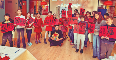 在招待會上,來賓們在書法展臺學寫“?!弊趾痛郝?lián),在版畫展臺體驗中國雕版印刷技藝,體驗中國非遺和年俗互動項目,了解中國傳統(tǒng)文化的悠久歷史和傳承發(fā)展等。