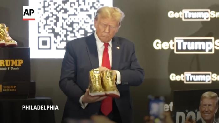 據(jù)報道,特朗普當(dāng)天在費(fèi)城會議中心舉行的球鞋展會上,手持一雙金色的“特朗普”牌球鞋進(jìn)行展示。