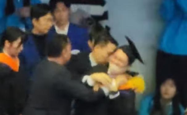 據(jù)在場人員透露,在尹錫悅致辭時,一名身穿學(xué)士服的男生面向尹錫悅所站立的講臺高喊。之后,總統(tǒng)警衛(wèi)人員捂住他的嘴巴,并把他強行抬出會場。