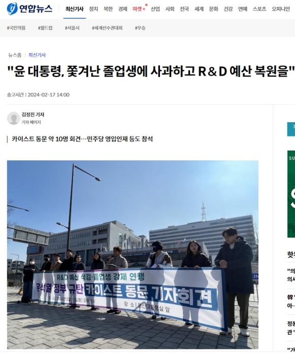 17日,韓國科學(xué)技術(shù)研究院的校友在龍山總統(tǒng)府前舉行記者會,他們表示:“尹錫悅總統(tǒng)毫不留情地堵住畢業(yè)生的嘴,并將其趕了出去,對此我們感到非常憤怒?!彼麄円笠a悅道歉,并恢復(fù)削減的研究與開發(fā)預(yù)算。