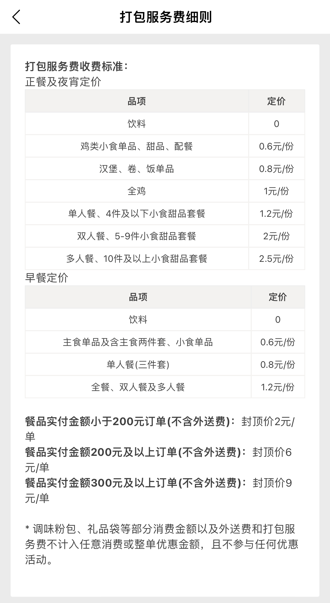 肯德基公布細則顯示,正餐及夜宵方面,雞類小食單品、甜品、配餐打包服務費為0.6元/份,漢堡、卷、飯單品打包服務費為0.8元/份,全雞打包服務費為1元/份,單人餐、4件及以下小食甜品套餐打包服務費為1.2元/份,雙人餐、5-9件小食甜品套餐打包服務費為2元/份,多人餐、10件及以上小食甜品套餐打包服務費為2.5元/份,飲料則不收打包服務費。